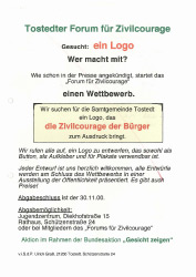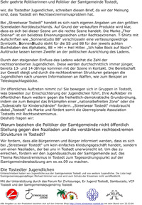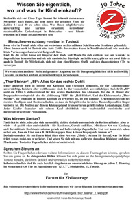 Ein zentraler Punkt in der Arbeit des Forums für Zivilcourage ist das Engagement für Demokratie und gegen Rechtsextremismus. Diese Aufgabe umfasst auch die Aufklärung über das Thema und die Situation in Tostedt. In erster Linie geht es dabei um einen Laden in Todtglüsingen, der von einem Angehörigen der rechten Szene in Tostedt betrieben wird. Immer noch gibt es viele Menschen in der Samtgemeinde, die nicht wissen, was sich hinter dem scheinbar harmlosen Laden verbirgt. So wurde das Infoblatt "Wissen Sie eigentlich, wo und was Ihr Kind einkauft?" entwickelt und gedruckt. Mit dem Blatt in Händen wandten wir uns unter anderem an Tostedter Vereine und Verbände, mit der Bitte, auch intern die Aufklärung fortzuführen. Auch bei einem Infotisch vor dem Kaufhaus Bade ging die Verteilung weiter.